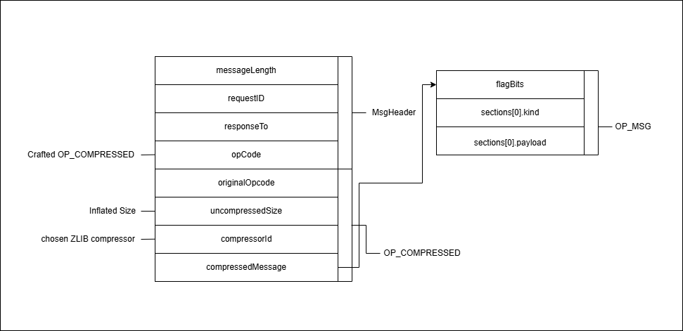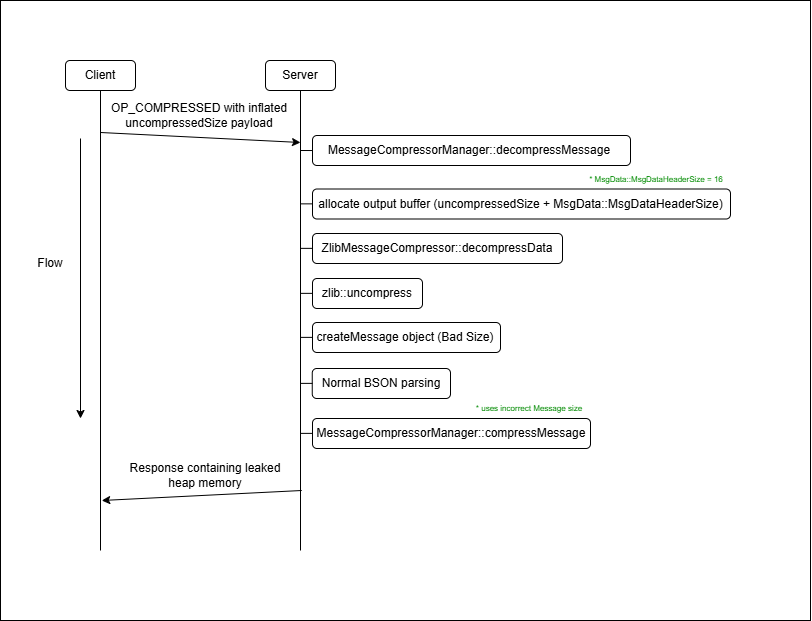 - 이후 정상적인 BSON 파싱을 거친 후 해당 Message 객체가 응답을 전송하는 과정에서 다시 압축될 때 Message의 잘못된 크기를 기준으로 초기화되지 않은 힙 메모리 데이터가 함께 포함되어 외부로 누출됩니다.