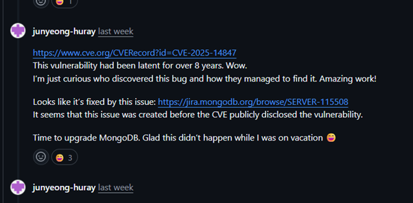 여담으로, Mongobleed과 직접적으로 연결되는 zlib 압축 코드는 2017년 6월 1일 PR 형태로 제안된 바 있었지만, 적절한 보완 없이 병합되었고 그 결과로 약 8년 동안 MongoDB 제품 전반에 취약점으로 남아 있었다는 사실이 놀라웠습니다.